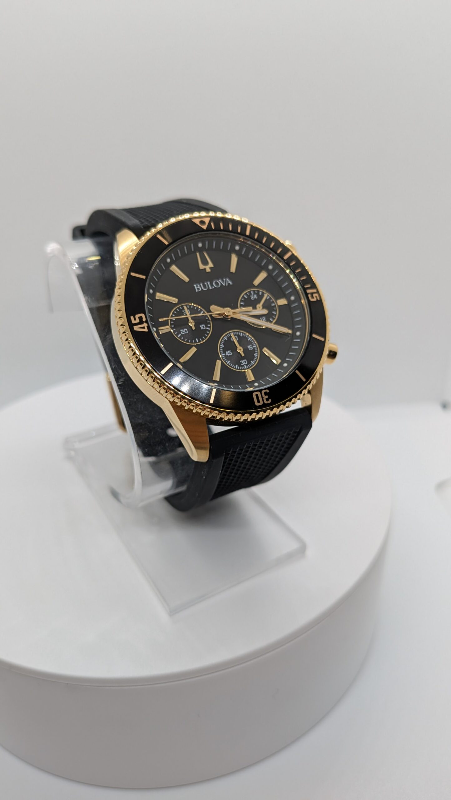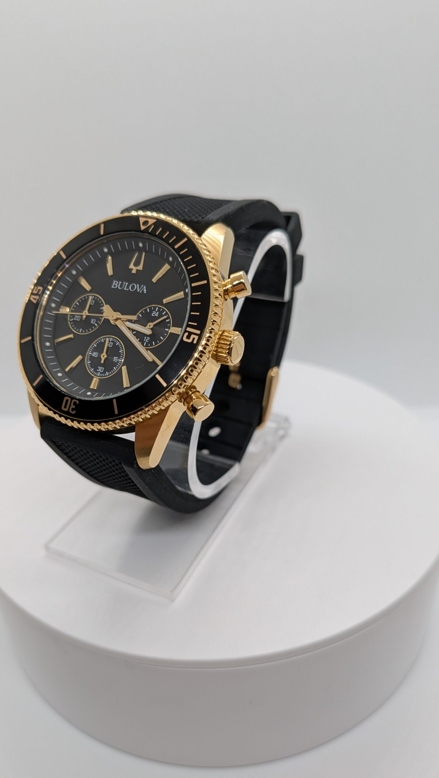 Stylish Bulova 98A250 Chronograph Watch Gold Tone Black Resin Strap