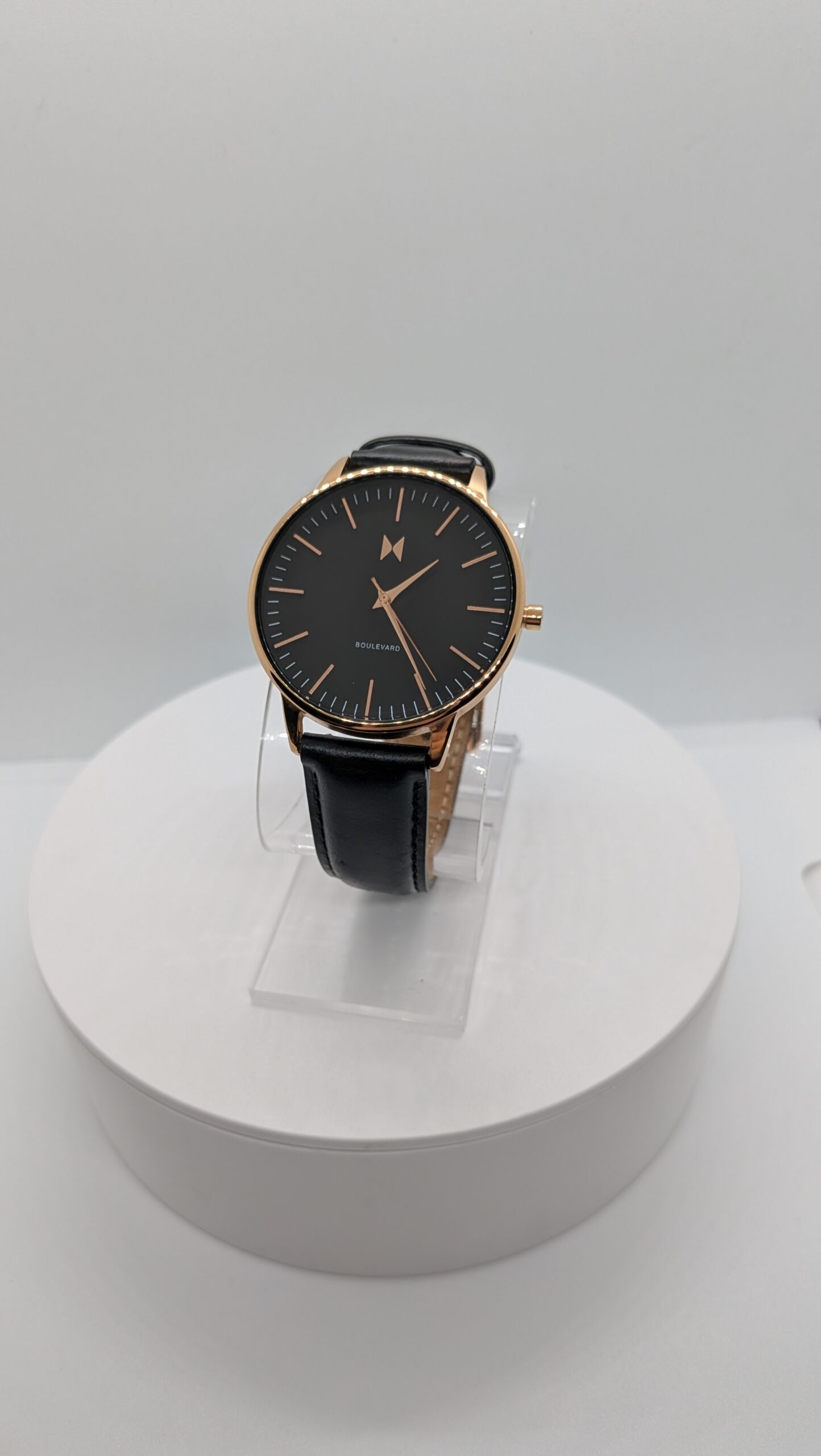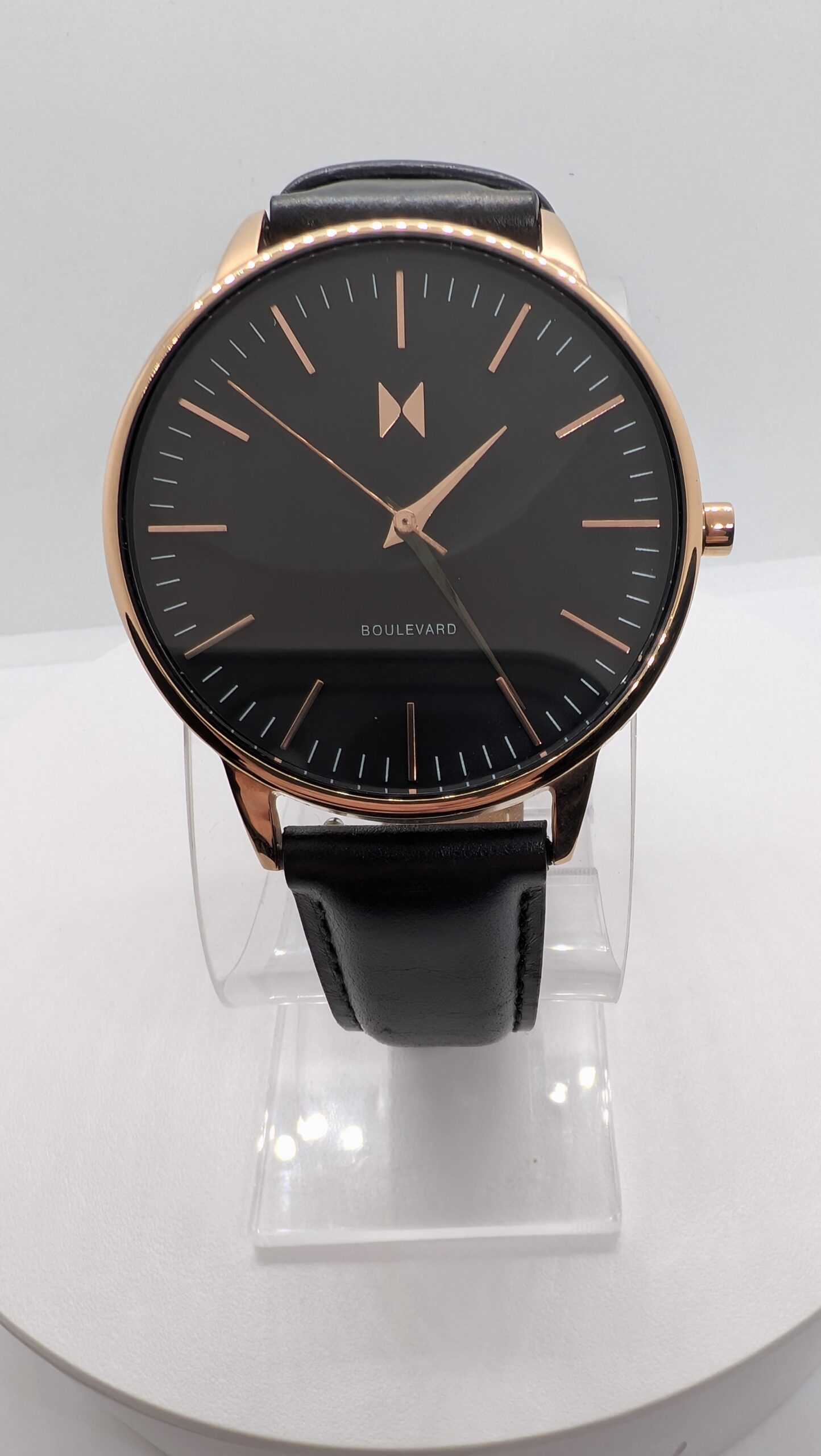 The MVMT by Movado Women’s Boulevard Santa Monica watch delivers modern elegance with a minimalist design. Featuring a 38mm rose gold–tone case, sleek analog dial, and a refined black leather strap, this timepiece offers a sophisticated look that transitions effortlessly from day to night. Its clean styling and balanced proportions make it an ideal accessory for both casual and dress wear.